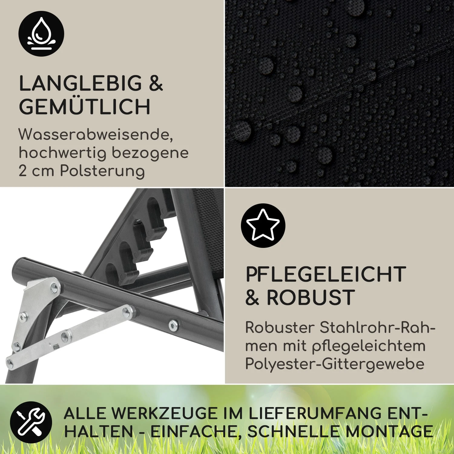 Mit der blumfeldt Amalfi Gartenliege genießt du die Sonne ganz entspannt und bequem. Dank dem gepolstertem Polyester-Gittergewebe ruhst du auf der 2 Meter langen Liegefläche wie auf Wolken. Damit sie allen Ansprüchen gerecht wird, kann die Rückenlehne in 5 Positionen von sitzend bis liegend befestigt werden – ganz nach persönlichem Geschmack. Für vollen Komfort in jeder Liegeposition sorgt die einstellbare Sonnenblende, die angenehmen Schatten im Gesicht spendet. Ein Kopfkissen rundet das Erholungsangebot ab. Bei allem Luxus kommt auch der langfristige Nutzwert nicht zu kurz: Der stabile Stahlrohr-Rahmen ist witterungsbeständig mit einer Pulverbeschichtung versehen, während die Polsterung aus schnell trocknendem Schaumstoff und einer abwischbaren Bespannung besteht.