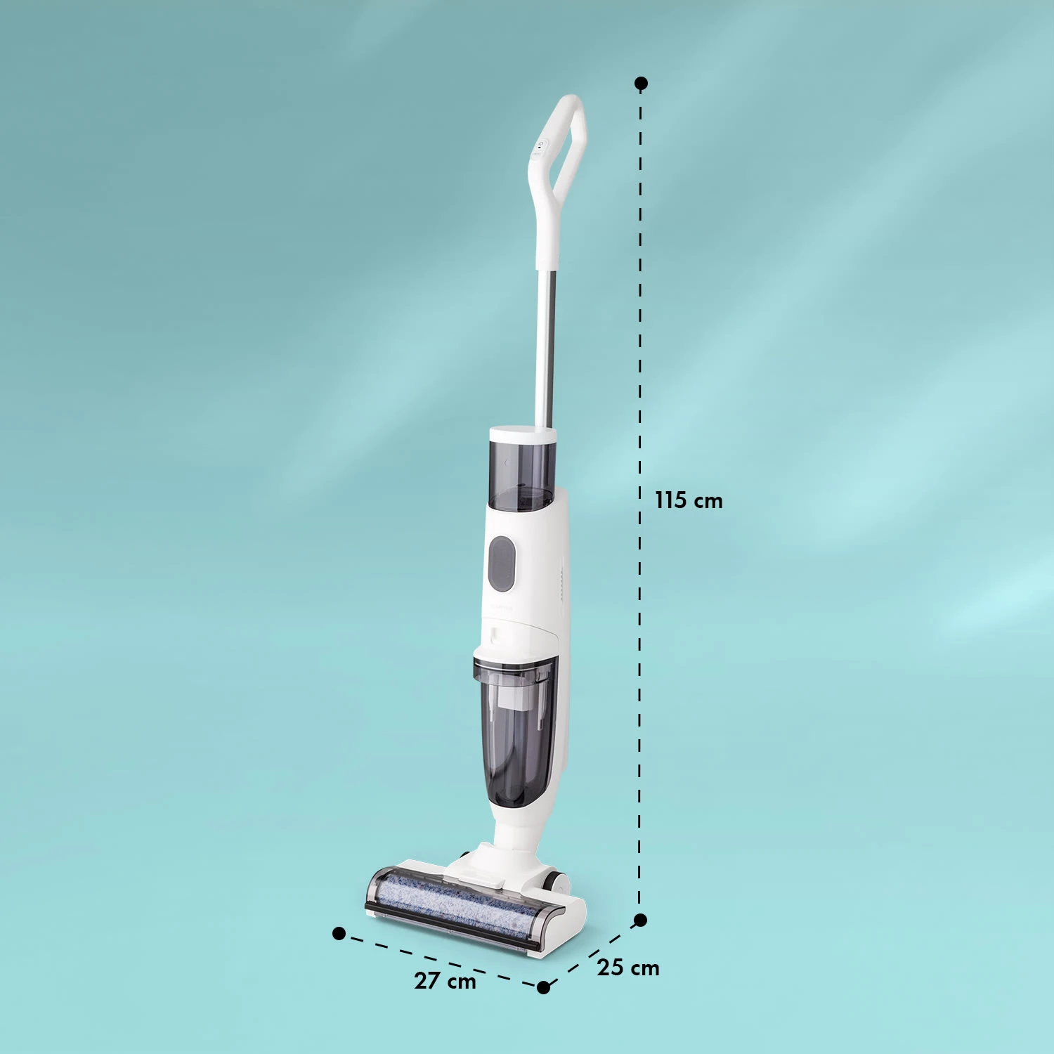 Kabellos, beutellos und kraftvoll rückt der Klarstein Caswell Staubsauger zuverlässig gegen Staub und Schmutz auf deinen Fußböden an. Das Besondere: Er ist kein herkömmlicher Handstaubsauger, der trocken den Staub entfernt. Er ist mit zwei Wassertanks ausgestattet, sodass du zeitgleich deine Böden gründlich absaugen und sogar wischen kannst. Dank Sprühtaste benässt er mit sauberem Wasser den Boden, während er anschließend das Wasser inklusive Schmutz zuverlässig einsaugt. Die motorisierte Bürste sorgt dabei für beste Sauberkeit, der integrierte HEPA-Filter entfernt selbst kleinste Staubkörner und am vorderen LED-Display kannst du die Funktionalität des praktischen Nass- und Trockensaugers bestens überblicken. Praktisch und zeitsparend ist auch die raffinierte Selbstreinigungsfunktion, dank welcher sogar die Bodenbürste jederzeit sauber und einsatzbereit ist.