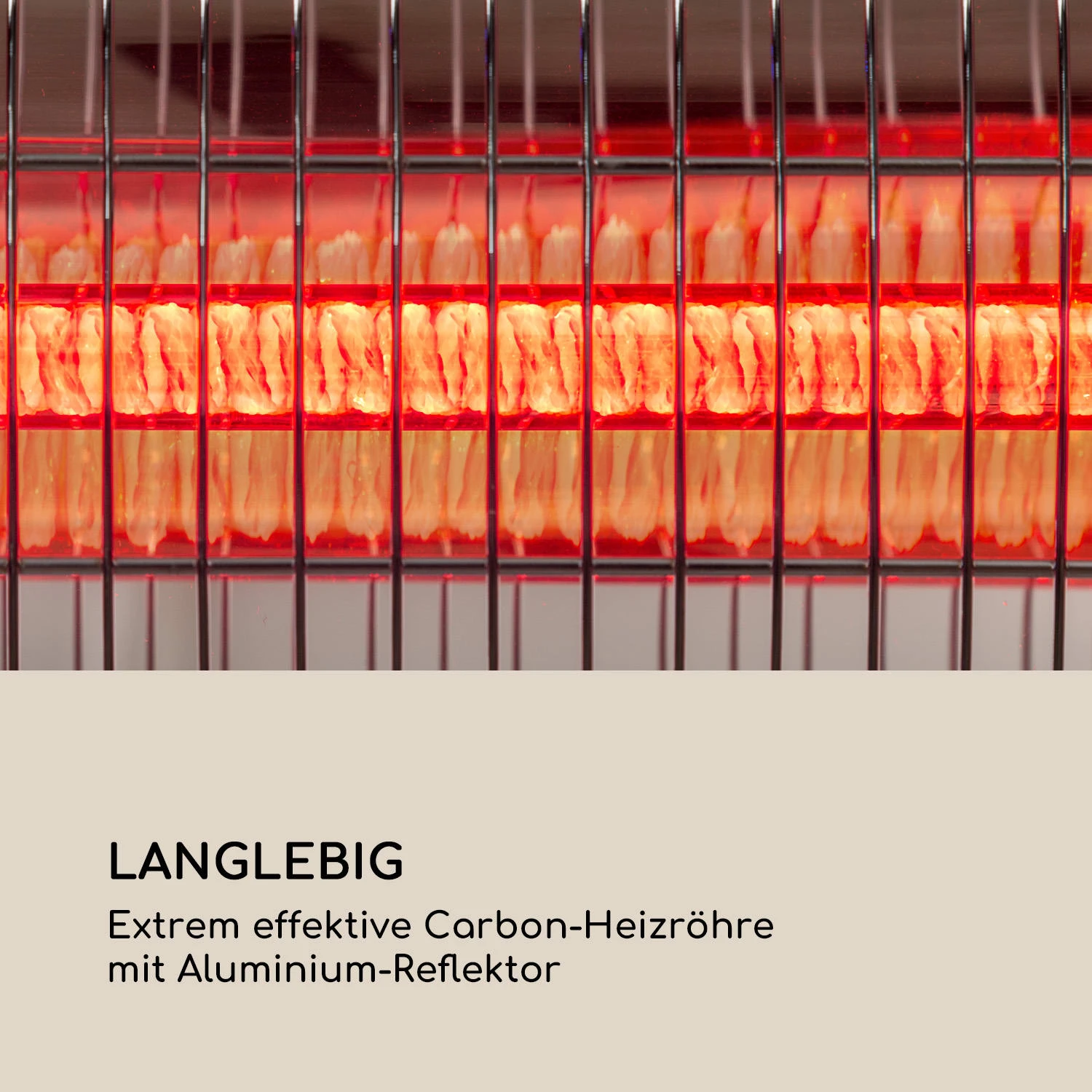 Der leichte blumfeldt Dark Wave Heizstrahler lässt sich einfach an der Wand montieren und steht dadurch nicht im Weg, während er alle Terrassengäste schnell und effizient mit 2000 Watt von oben wärmt. Durch die IR ComfortHeat-Technologie werden dabei gezielt angestrahlte Personen und Objekte erwärmt und nicht die Luft der Umgebung. Ein absolutes Highlight – oder in diesem Fall eher Lowlight – ist die MinimalGlare Heating Tube: Die Infrarot-Carbonröhre ist speziell mit Gold beschichtet, um nahezu alles abgestrahlte Rotlicht zu filtern. Dadurch wird beim blumfeldt Dark Wave Heizstrahler der Name zum Programm, denn er strahlt nahezu kein sichtbares Licht ab und ist absolut blendarm, auch wenn man direkt in die Heizröhre schaut. So kann jeder den Wärmebereich ungeblendet genießen. Mit seinem praktischen Touch-Panel mit LED-Display lässt sich auf Berührung eine von 9 Wärmestufen wählen oder der Abschalttimer in Stundenschritten von 1 bis 24 Stunden einstellen. So kannst du ganz unbesorgt Abendessen, Gartenpartys oder Garagenfeste planen, ohne dir um die Temperaturen Gedanken zu machen, denn mit einem Klick des Kippschalters wird ohne lange Aufwärmphase direkt eine angenehme, heimelige Wärme erzeugt. Für die Installation im Außenbereich sind direkt die nötigen Wandhalterungen dabei. Und natürlich ist das Gehäuse nach IP65 spritzwassergeschützt.