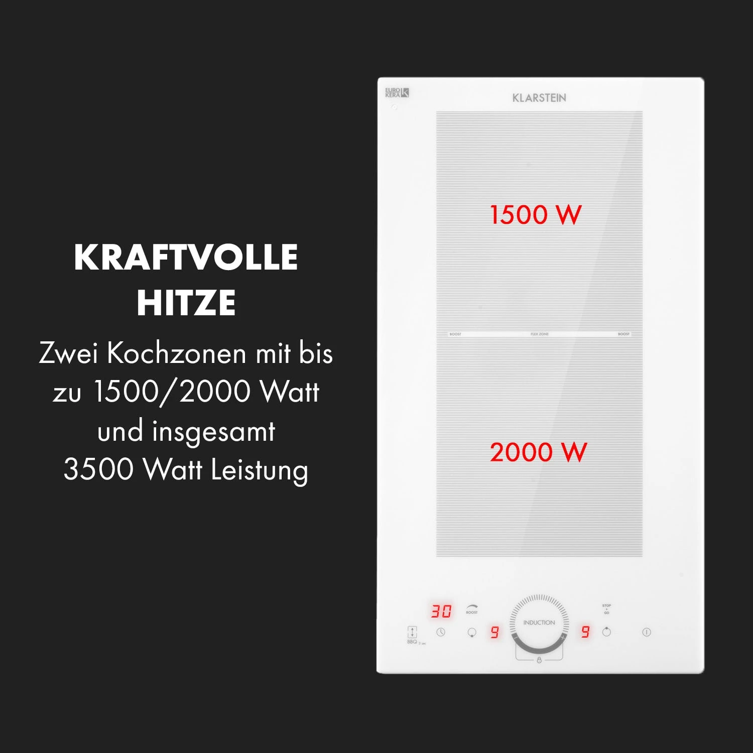 Zwei Kochflächen für den Genuss bietet das Einbaukochfeld bei einer Gesamtleistung von maximal 3500 Watt, die sich mit 1 x 2000 und 1 x 1500 Watt auf die einzelnen Kochflächen verteilen und die Inhalte von Töpfen und Pfannen in Spitzenzeiten zum Kochen bringen. Dabei vereinen sich per VarioHeating die beiden Kochzonen zu einer Flexzone.