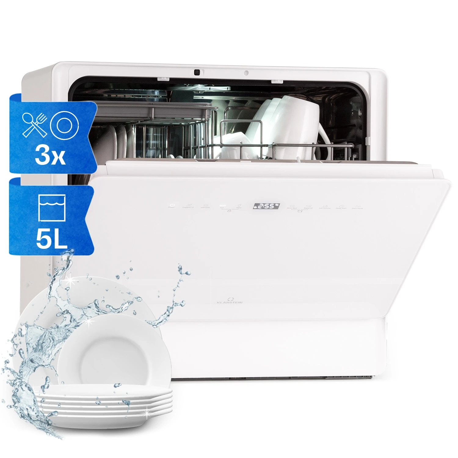 Die Klarstein Emerald 5 Slim Geschirrspülmaschine ist mit ihrer kompakten Größe und zahlreichen Programmen ideal zur Nutzung in kleinen Wohnungen geeignet! Das Touch-Bedienfeld ermöglicht dabei eine einfache Bedienung und sorgt für beste Übersicht. Mit 7 verschiedenen Programmen und nur ca. 8 Litern Wasserverbrauch pro Spülgang bringt die Emerald 5 Slim dein Geschirr und Besteck zuverlässig zum Glänzen. Ein besonders nützliches Feature ist das automatische Öffnen der Frontklappe nach dem Spülvorgang, so kann Wasserdampf entweichen und das Geschirr ist direkt schrankfertig.
