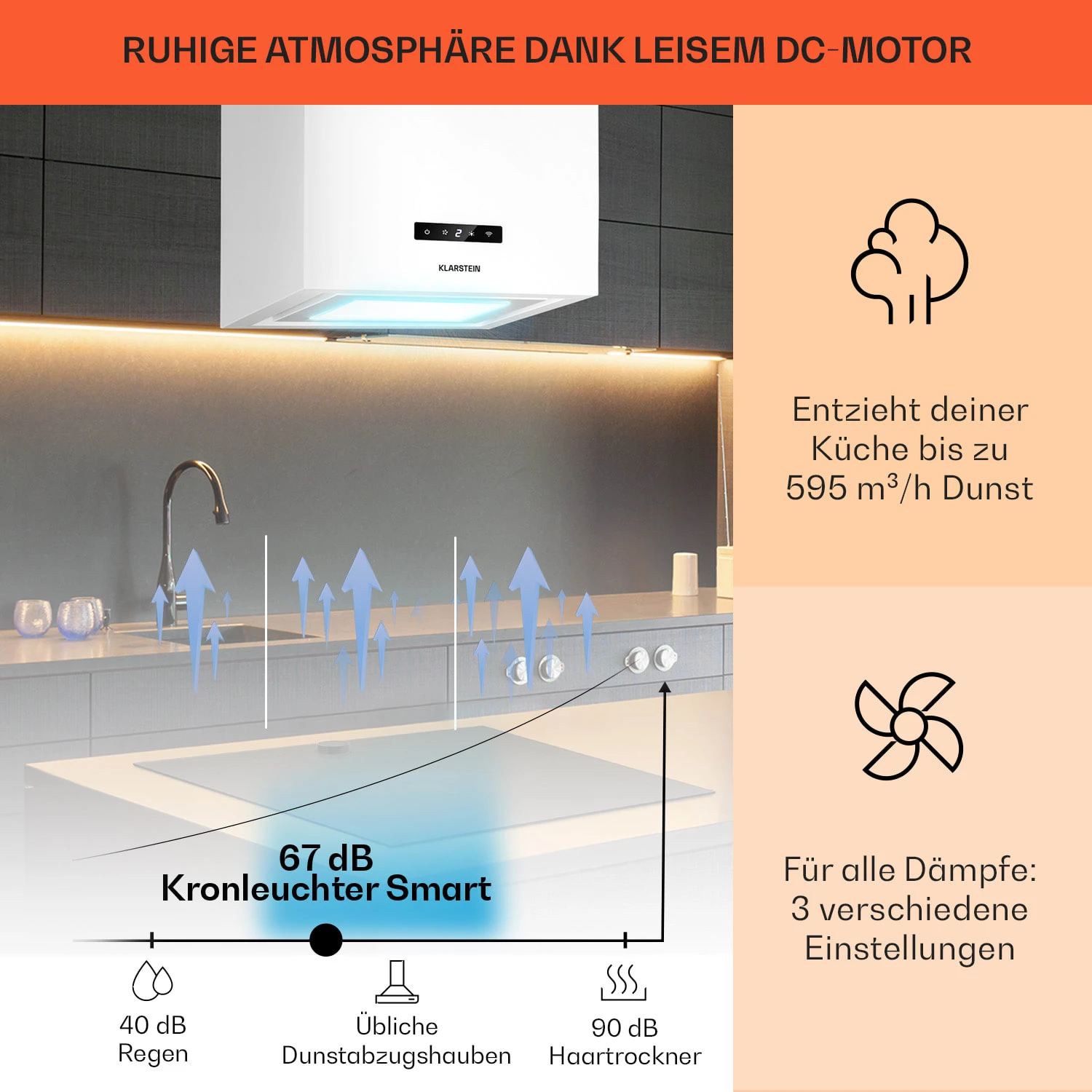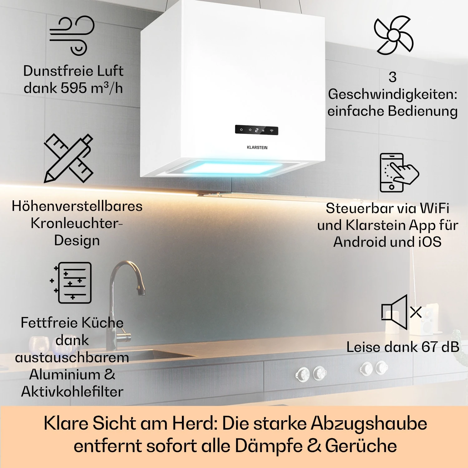 Beim Kornleuchter Smart von Klarstein ist der Name auch Programm: Die smarte Inselabzugshaube sorgt mit einem Luftdurchsatz von bis zu 595 m³/h für saubere und klare Luft in der Küche. Das integrierte 6500 Kelvin starke LED-Panel leuchtet dein Kochgeschehen taghell aus. Die Steuerung erfolgt ganz bequem via Klarstein App. Hochwertige Materialien und das kubische Design vereinen sich zu einem echten Blickfang. Mit drei Leistungsstufen, einem niedrigen Betriebsgeräusch von 67 dB und Energieeffizienzklasse A überzeugt der Klarstein Kronleuchter Smart vollends.