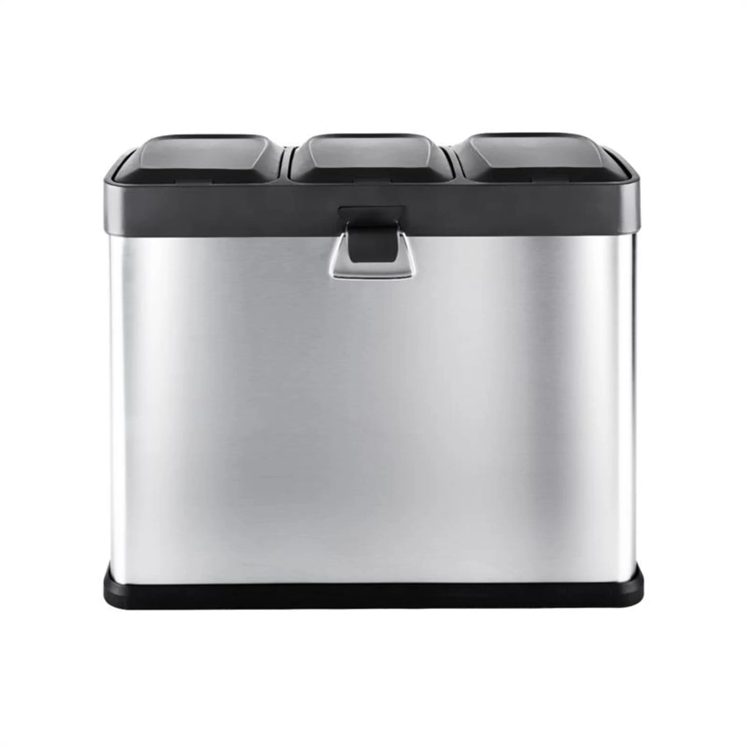 Das Gehäuse des Mülleimers besteht aus rostfreiem Edelstahl und verfügt über einen bodenschonenden Kunststoffsockel. Drei herausnehmbare Kunststoffeimer mit jeweils 15 Liter Volumen, bieten Platz für Restabfall, Biomüll und den gelben Sack. Die Einsätze können mittels praktischem Tragehenkel, schnell und separat voneinander entleert werden.