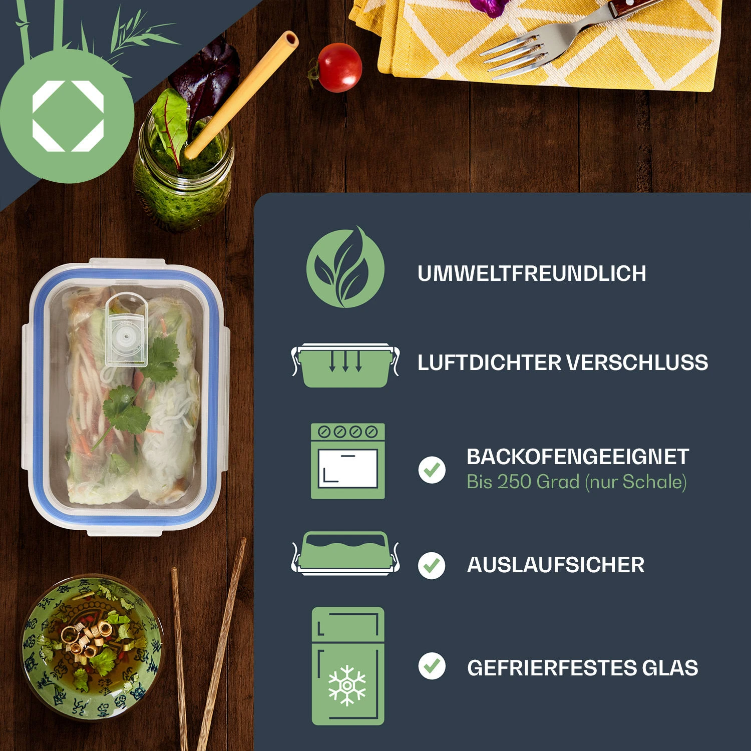 Mit der hochwertigen, rechteckigen Glasbox von Klarstein bleiben Speisen und Lebensmittel lange frisch. Der Deckel mit Öffnung liegt luftdicht auf, so behalten die aufbewahrten Lebensmittel lange ihr Aroma. Auslaufsicher sind die Lebensmittelboxen zudem durch die sicheren Bügelverschlüsse. Das Glas der Schale ist besonders hitze- und kältebeständig. Die Klarstein Glasbox im günstigen 4er-Set ist geeignet für Backofen oder Mikrowelle (ohne Deckel) und behält auch im Gefrierfach ihre schöne Form.