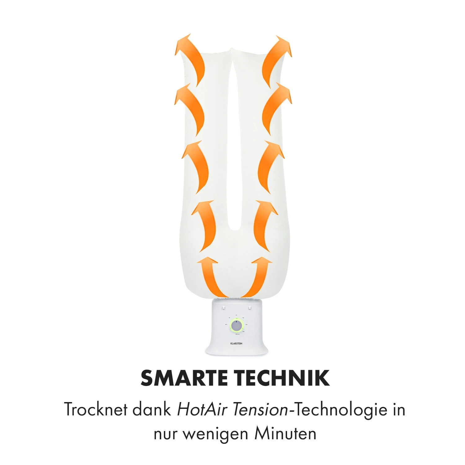 Das 2-in-1 System ermöglicht es dem Klarstein ShirtButler Deluxe nicht nur zeitsparend zu trocknen, sondern auch zuverlässig zu bügeln. Die Kleidungsstücke werden nach dem Waschgang spielend einfach über einen der beiden Ballonkörper gezogen, die durch einen 1250 Watt Sicherheits-Heizer durchgängig mit Luft befüllt werden. Dank HotAir Tension-Technologie und dem luftdurchlässigen Oxford-Nylon Material entweicht sämtliche Feuchtigkeit aus Hemden, Hosen, Blusen und T-Shirts bereits nach wenigen Minuten. Gleichzeitig kann mit einem 6-stufigen Timer von 0 bis 180 min. die ideale Trocken- bzw. Bügelzeit für die jeweiligen Kleidungsstücke ausgewählt werden. Dank einer geringen Lautstärke verspricht das Gerät zudem einen besonders leisen Betrieb. Ein platzsparendes Verstauen wird durch die kompakte Größe des Trocken- und Bügelwunders gewährleistet. Ein LED-Kontrolllicht zeigt darüber hinaus verlässlich die Auswahl der möglichen Optionen an.