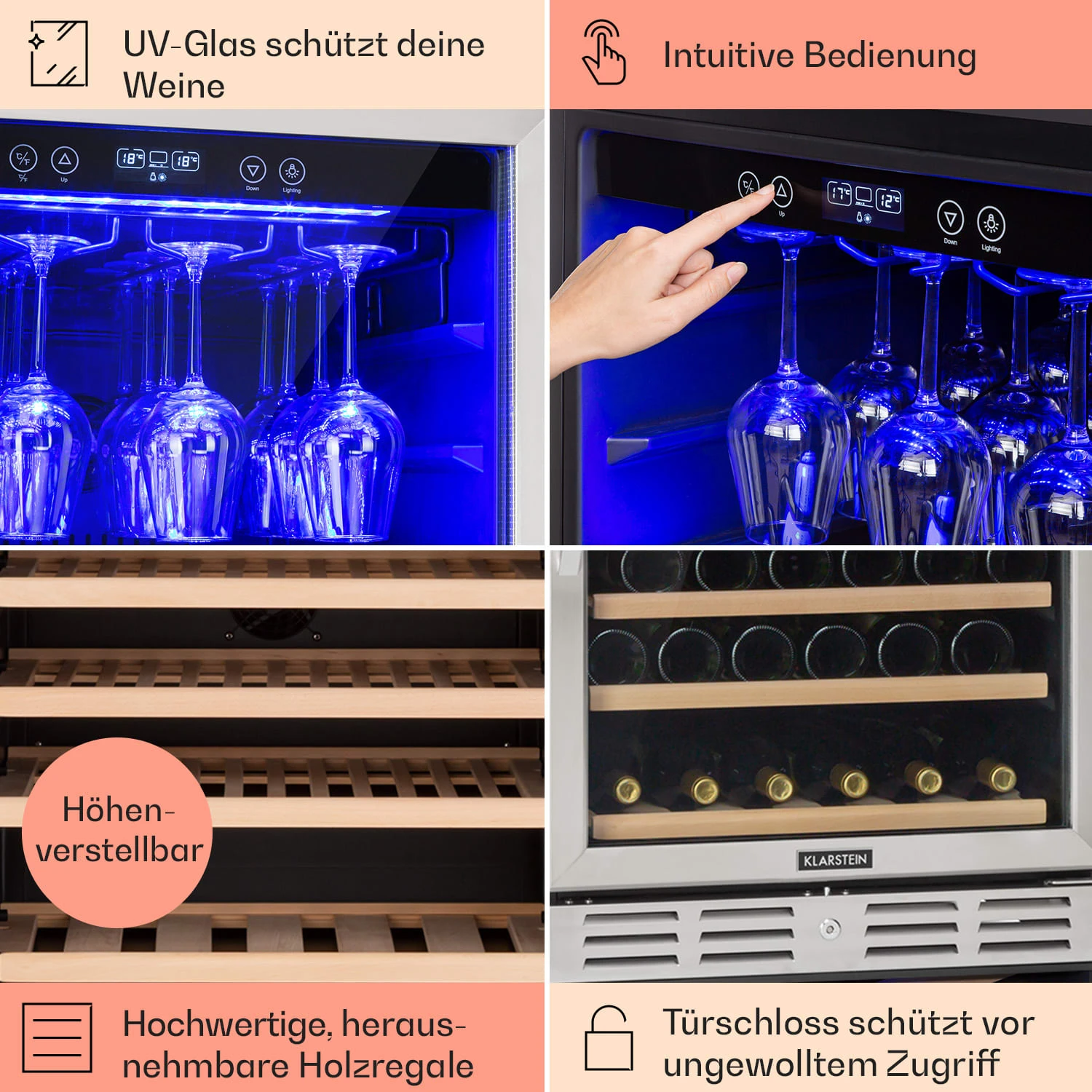 Edles Design und farbig inszenierte Weinvorräte: Der Klarstein Vinovilla Grande 127 Built-in Uno Weinkühlschrank kühlt und lagert Weine ideal – dabei ist er ein wahrer Blickfang in jedem Raum. Neben der modernen, Edelstahl-gerahmten Glastür trumpft der Vinovilla Grande 127 Built-in Uno vor allem durch seine blaue LED-Innenbeleuchtung sowie den integrierten Weinglasträger auf. So bereichert er nicht nur Wohnlandschaften und Küchenzeilen, sondern hebt die Weinbestände bei jedem Anlass deutlich hervor.