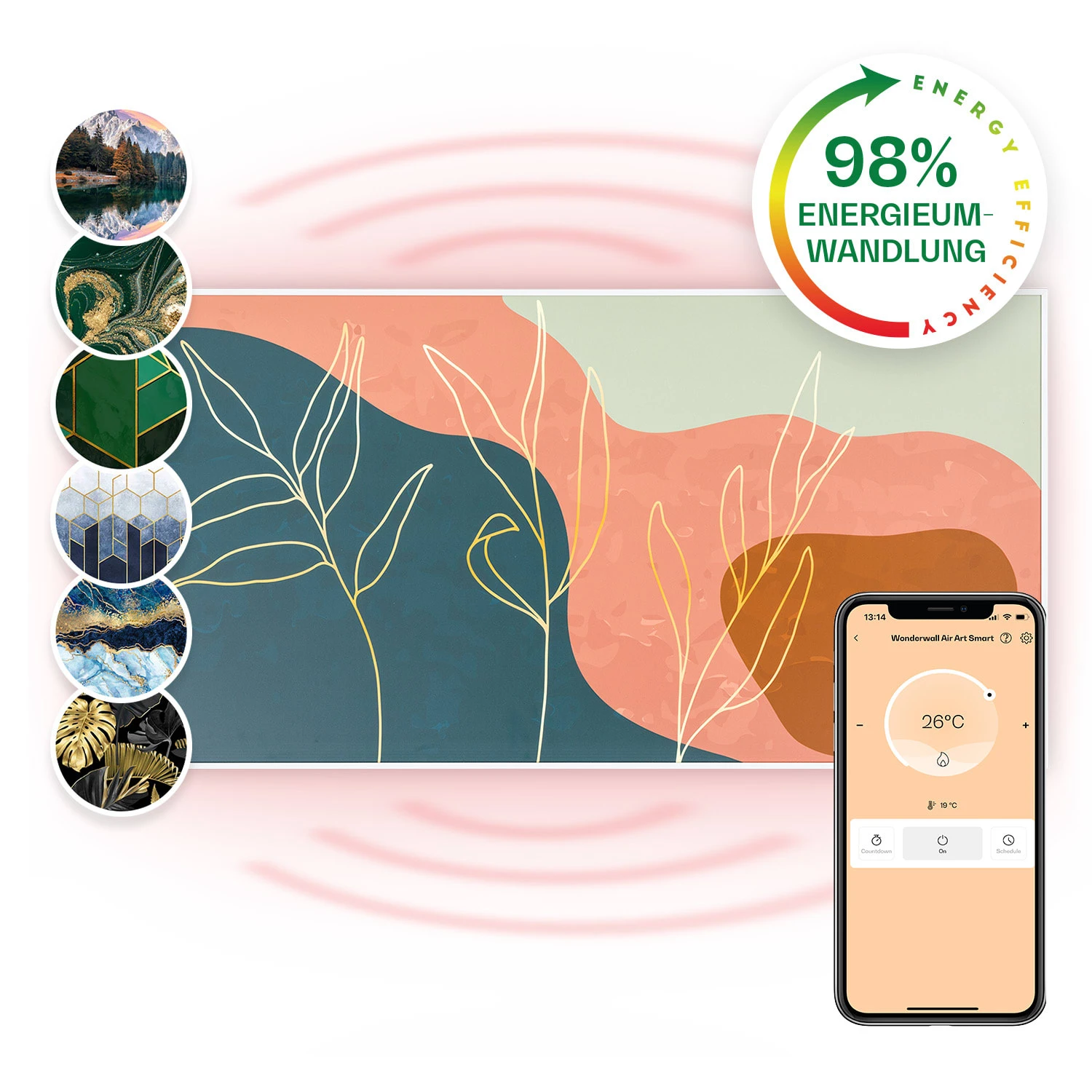 Die Klarstein Wonderwall Air Art Smart Infrarotheizung revolutioniert die Beheizung mit moderner Technik. Superflach kannst du das Heizpanel wie ein Bild direkt an die Wand hängen. Mit seinen 700 Watt Leistung macht es sich dank IR ComfortHeat dabei das Prinzip der Sonnenwärme zu nutze: Anstatt langsam die Luft zu erwärmen, gibt es angenehme Infrarotwärmestrahlen ab, die direkt Personen und Objekte im Wirkungsbereich von etwa 14 m² erwärmen. Dabei ist deine neue Elektroheizung äußerst energieeffizient: Ganze 98 % der aufgenommenen Leistung werden in Wärmestrahlen ungewandelt. Thermostat, Auto-Abschaltfunktion, Wochentimer, lautloser Betrieb und smarte WiFi-Steuerung per App runden die innovative Heizmöglichkeit raffiniert ab.